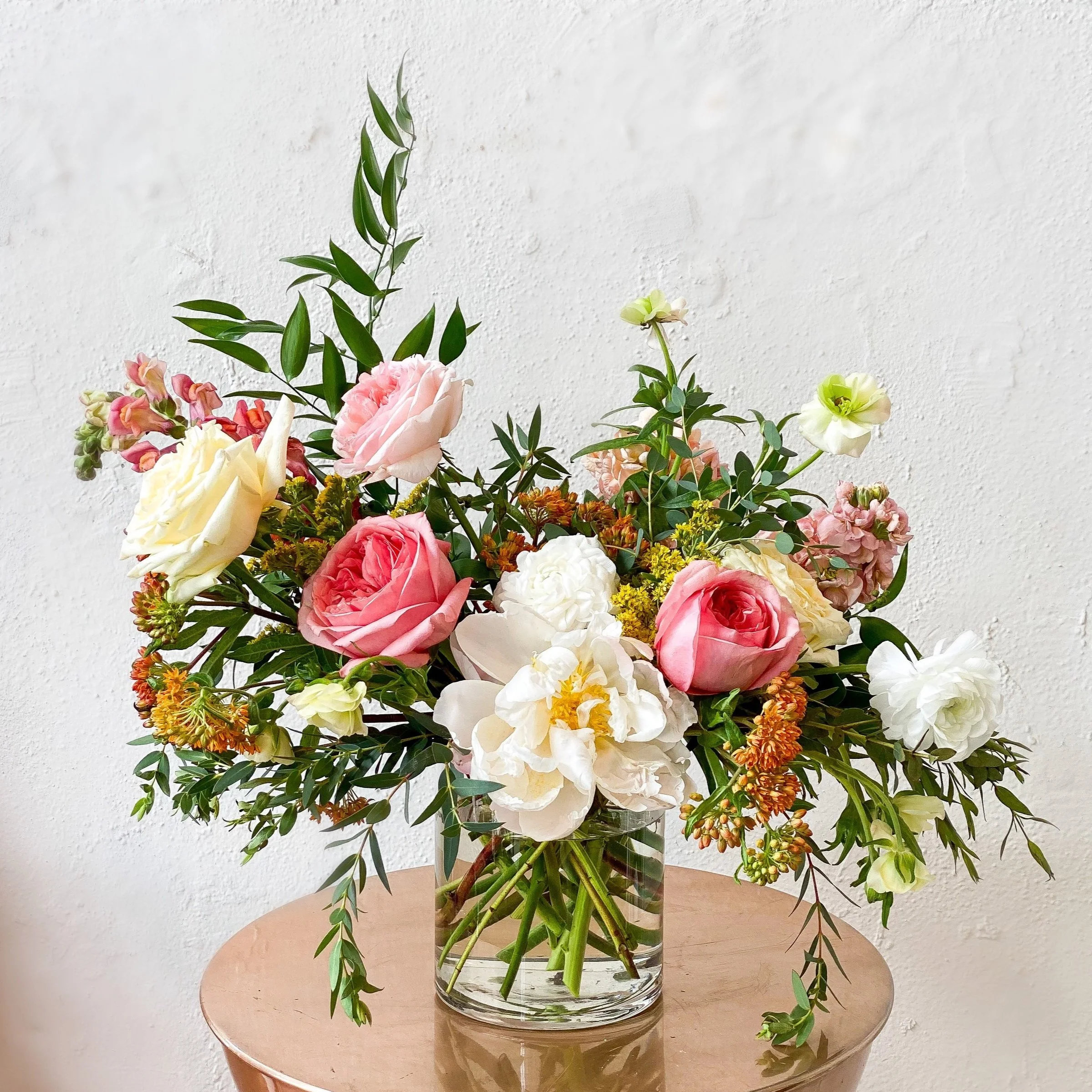 Designers choice of seasonal premium, unique blooms arranged in a glass vase.